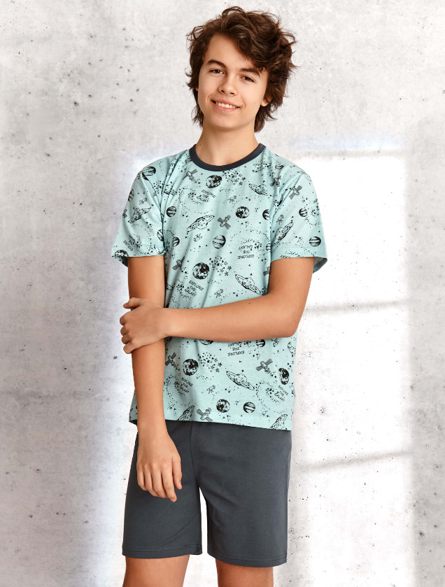 chlapecké pyžamo s kraťasy, kulatý výstřih se šedým lemováním. Na přední straně obrázky planet. Kalhoty kraťasy jednobarevné, v pase do gumy. Velmi kvalitní 100% bavlna od výrobce Taro. Pro tatínky máme stejné pyžamko Max.