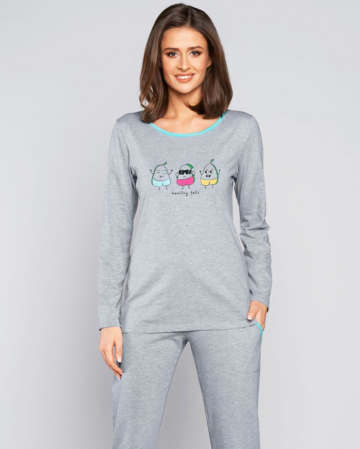 dámské pyžamo s dlouhým rukávem a dlouhými kalhotami. Výstřih do kulata je olemován kontrastní látkou. Na přední straně obrázek s nápisem. Kalhoty jendobarevné, v pase do gumy a dvěma bočními kapsami. Výrobce: Italian Fashion.
