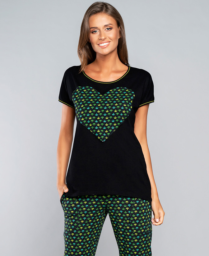 dámské pyžamo s krátkým rukávem a 3/4 kalhotami. Výstřih do kulata, žluté prošití u výstřihu a na rukávech. Na přední straně srdíčko s malými obrázky konopí. Kalhoty s potiskem, v pase do gumy a dvěma bočními kapsami olemované jednobarevnou látkou. Pro pány můžeme nabídnout stejné pyžamko Ozzy. Výrobce: Italian Fashion.