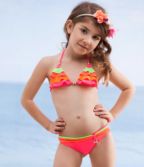 - dívčí plavky,  podprsenka trojúhelníčky s krásnými volánky různé barvy, ve středu ozdobné kuličky, které jsou i na ramínkách, zavazování za krk a na zádech, kalhotky s ozdobnými šňůrkami různé barvy