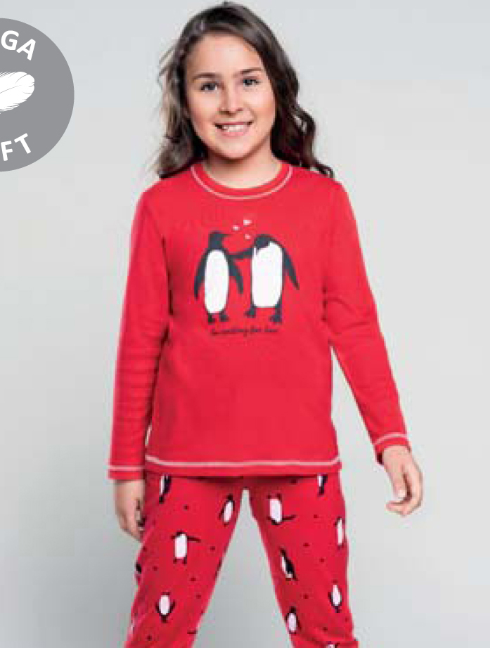 - dívčí pyžamo s dlouhým rukávem, vrchní díl s obrázky tučňáků. Kalhoty s potiskem tučňáčků, zakončené lemem, v pase do gumy. Krásný měkoučký materiál. Maminky můžou mít stejné pyžamko - dámské pyžamko Darla.