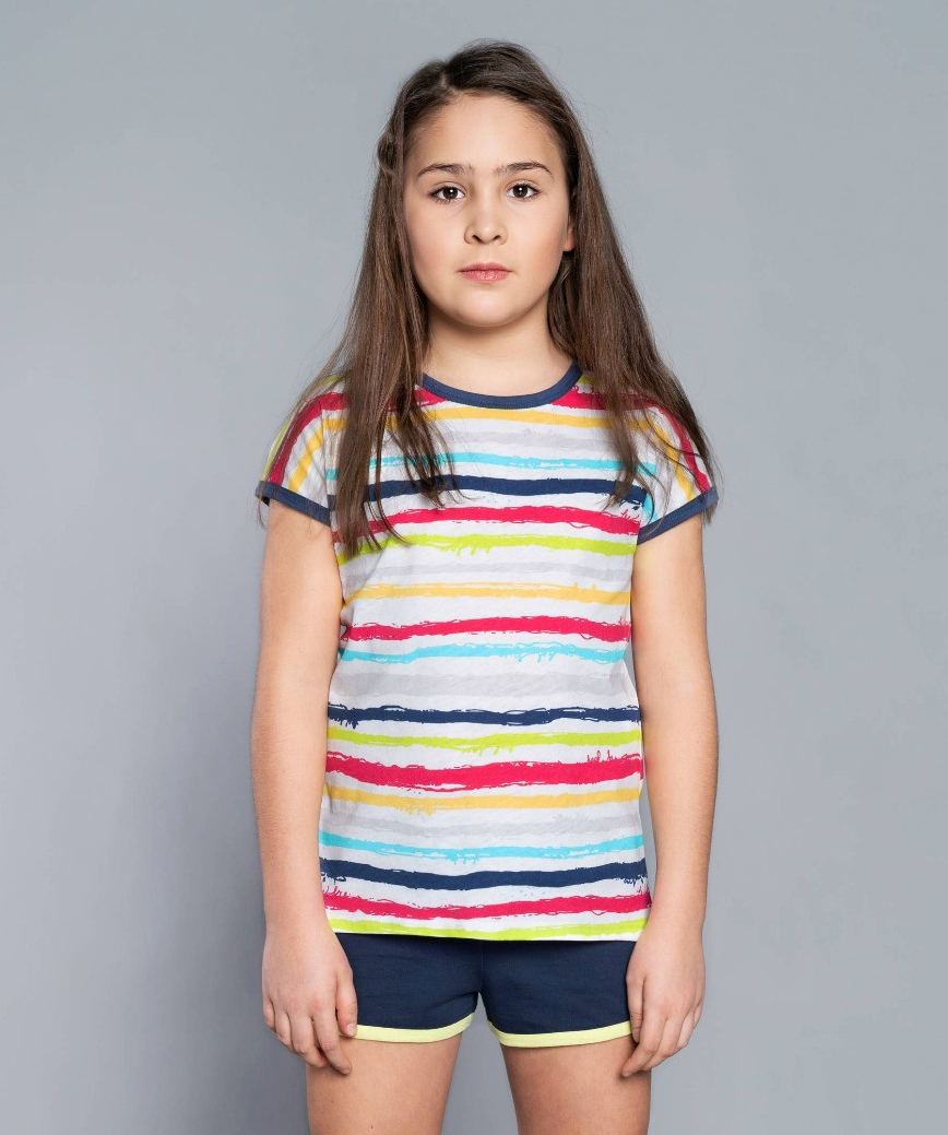 - dívčí pyžamo s krátkým rukávem a kraťasy. Okolo výstřihu a rukávu je tmavě modrý lem. Proužek po celém vrchním díle. Kraťasy tmavě modré s žlutým lemem, v pase do gumy. Velmi kvalitní bavlněný výrobek od Italian Fashion.