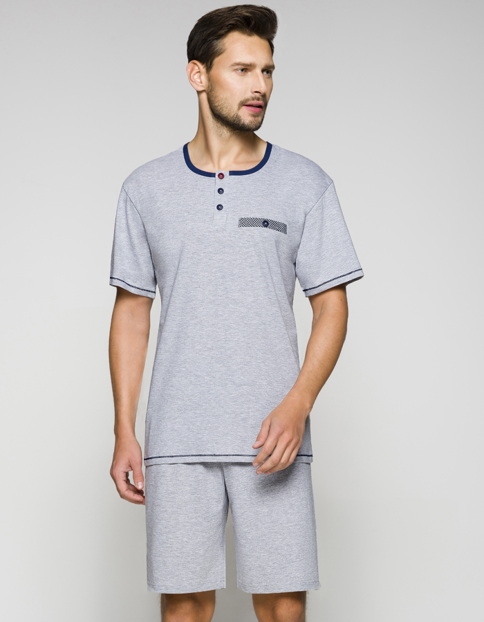 - pánské pyžamo s krátkým rukávem, výstřih do kulata olemován kontrastní barvou + propínání na knoflíkovou légu (3 knoflíčky). Kapsička - jen našitý kárečkový lem s knoflíčkem. Kontrastní prošití na rukávech a ve spodní části. Kraťasy do gumy - jednobarevné. Výrobce Regina