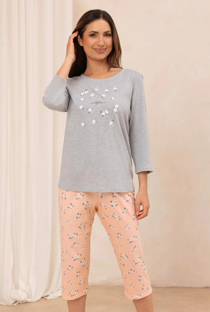- dámské pyžamo s 3/4 kalhotami i 3/4 rukávem. Výstřih do kulata. Na přední straně je obrázek doplněný kytičkami a malým nápisem. Kalhoty 3/4 s potiskem kytiček, v pase do gumy. Nádherný bavlněný materiál. Výrobce: Regina