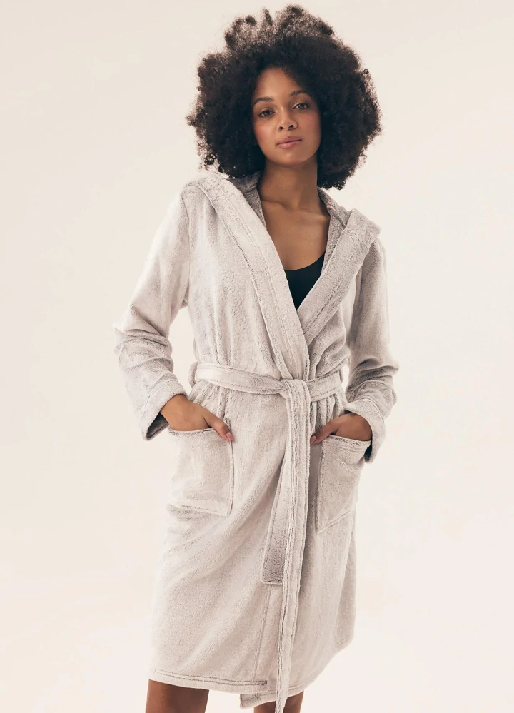 - dámský župan s kapucí, délka ke kolenům.  Župan s kapucí a pásek na stažení.  Dvě kapsy. Měkoučký a teplý materiál, který je příjemný na nošení.  Krásný teploučky materiál, jemný na dotek, ve které se budete cítit celý den nádherně.