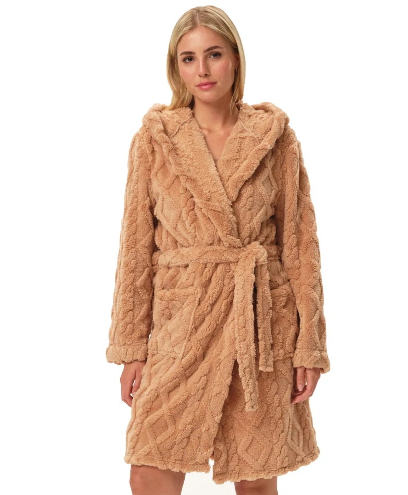 - dámský župan s kapucí, délka nad kolena. Župan s kapucí. Kapuce je ozdobená vystouplým vzorem. Na bocích jsou dvě kapsy. Pásek na stažení. Měkoučký a hebký materiál, který je příjemný na nošení. Krásný a teplý materiál, jemný na dotek, ve které se budete cítit celý den nádherně.