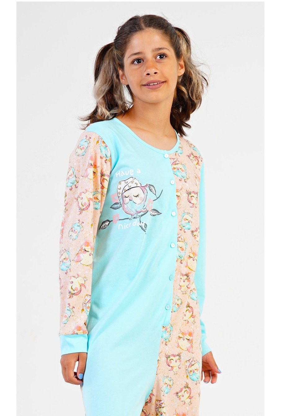 Dívčí overal na spaní Sovičky - Vienetta Secret - dívčí overal na spaní s dlouhým rukávem,  rozepínání overalu na knoflíčky, rukávy zakončené lemem, kalhoty zakončené lemem. Potisk soviček na 1/2 overalu na druhé 1/2 jeden větší obrázek sovy. Nádherná barevná kombinace. Bavlněný materiál - tenčí. Vý... celý popis