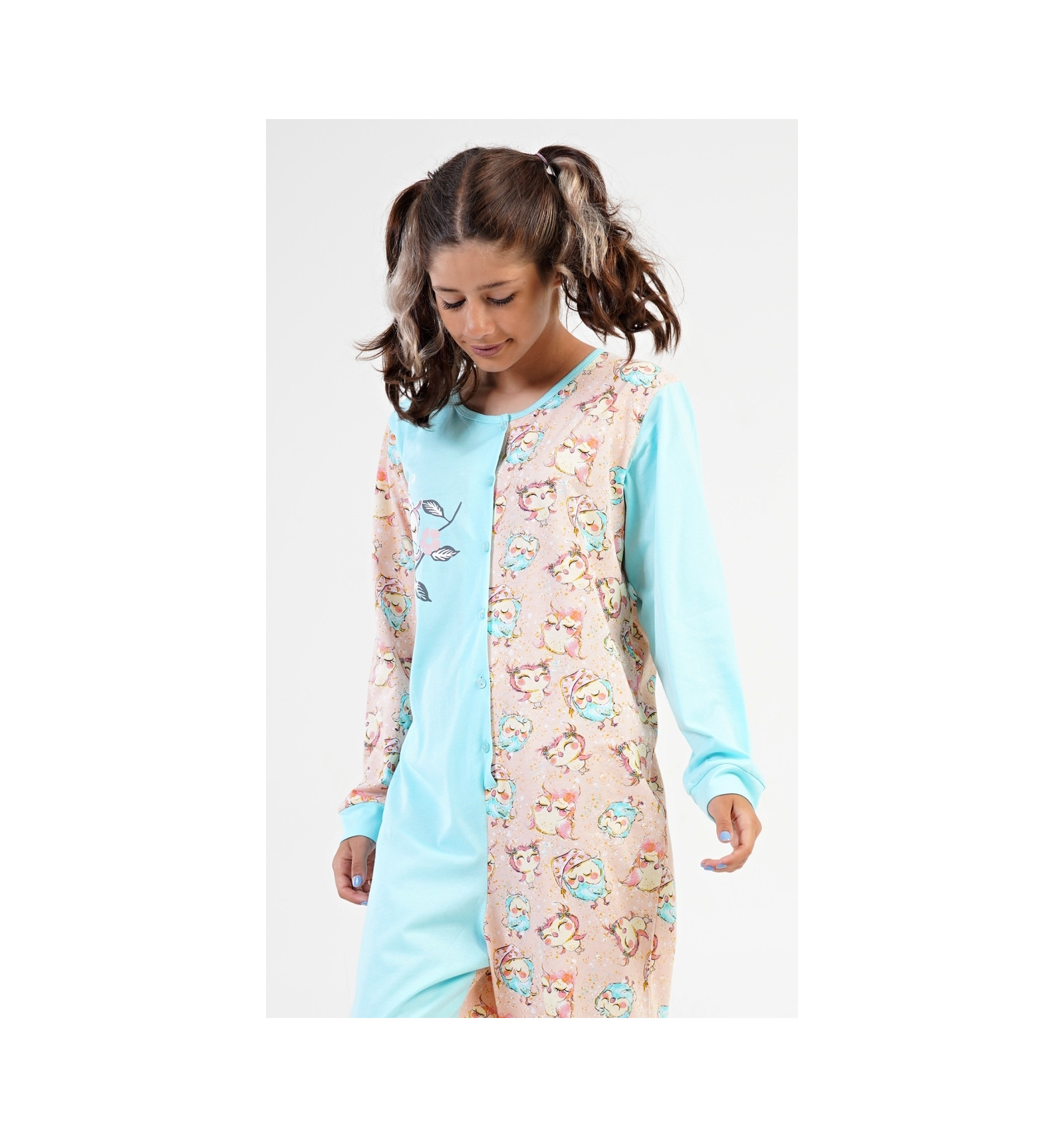 - dívčí overal na spaní s dlouhým rukávem, rozepínání overalu na knoflíčky, rukávy zakončené lemem, kalhoty zakončené lemem. Potisk soviček na 1/2 overalu na druhé 1/2 jeden větší obrázek sovy. Nádherná barevná kombinace. Bavlněný materiál - tenčí. Výrobce Vienetta Secret.