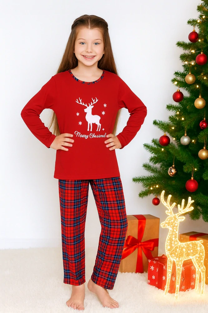 - dívčí pyžamo s dlouhým rukávem a dlouhými kalhoty. Výstřih do kulata je olemován látkou kalhot. Vánoční obrázek s malým nápisem Merry Christmas. Kalhoty kárečkové, na bocích kapsy olemovány červenou látkou, v pase do elastické gumy. Krásné a jemné bavlněné pyžamko. Maminky můžou mít stejné pyžamko. Cenově velmi výhodné pyžamko. Výrobce: La Penna - Turecko