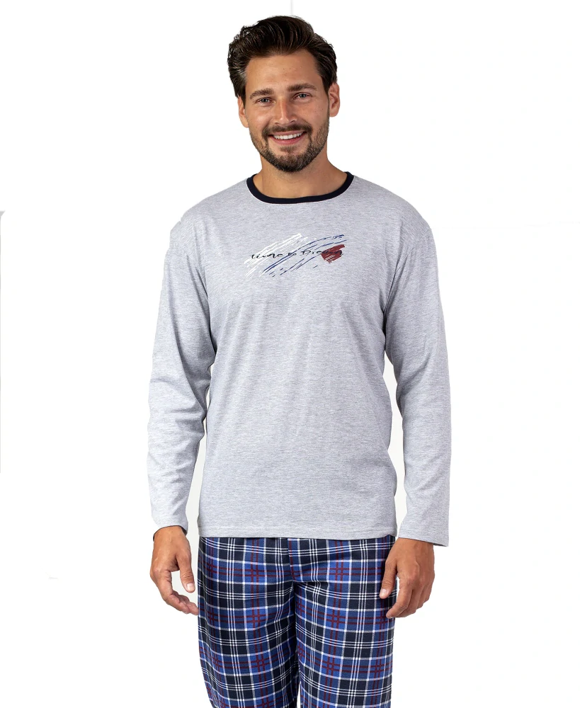 - pánské pyžamo s dlouhým rukávem. Výstřih do kulata je olemován tmavým lemem. Na přední straně ozdobný obrázek s nápisem. Kalhoty dlouhé, kárečkové, v pase do gumy. Velmi kvalitní bavlněný materiál. Výrobce Regina.