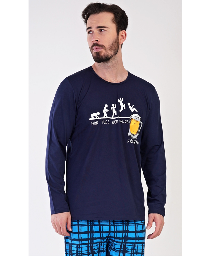 - pánské pyžamo s dlouhý rukávem a dlouhými kalhotami. Výstřih do kulata. Pyžamo pro milovníky pivečka. Nápisy na přední straně. Kalhoty do gumy, kárečkové. Bavlněný materiál je příjemný na spaní - tenčí bavlna. Výrobce Vienetta Secret
